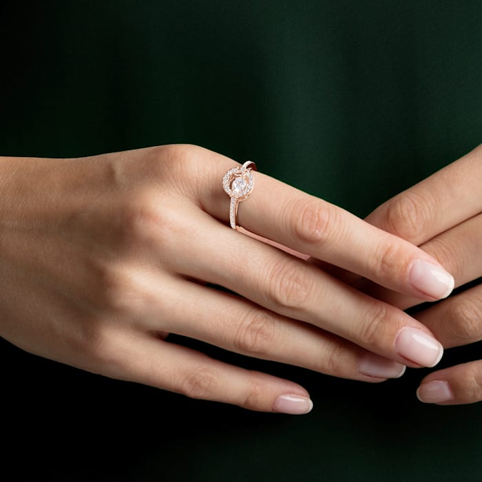 This stunning rose gold-plated ring would make a lovely gift for Mother’s Day and beyond. The first time our innovative ‘dancing crystal’ concept has been used in a ring, the design features a round stone inside a 3D cage enhanced with crystal . A timeless addition to any jewelry box.